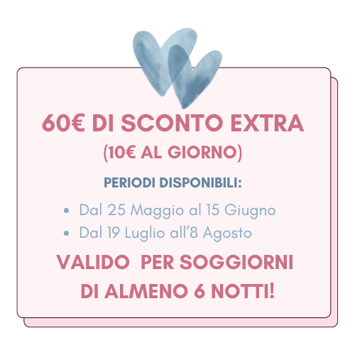 - Teli Mare & Relax: Al momento del check-in vengono forniti 2 teli per camera, con una cauzione di 10€ per telo. È garantito 1 cambio a settimana